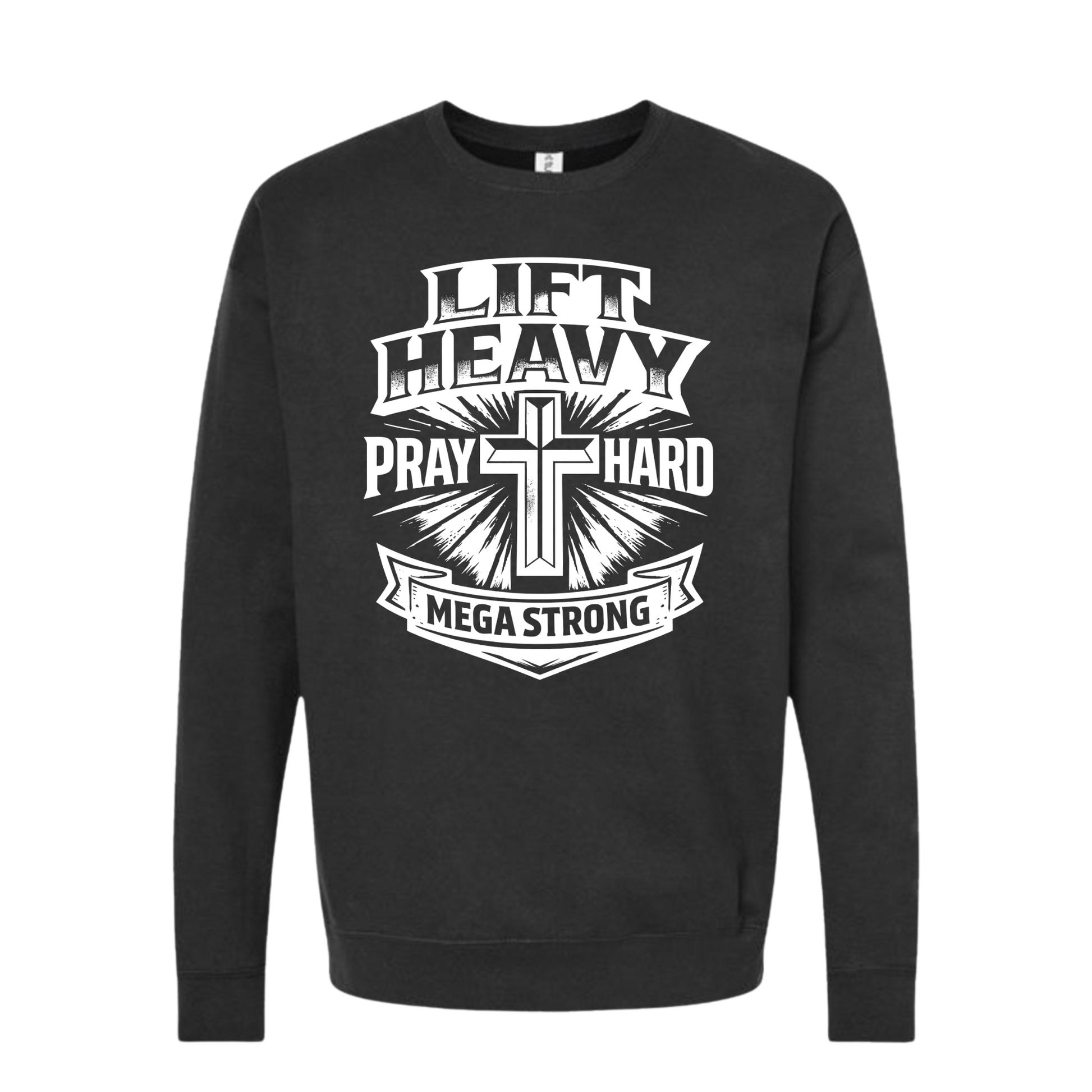 NEW! Black Unisex “Lift Heavy. Pray Hard. Mega Strong” Crew Neck Sweatshirt